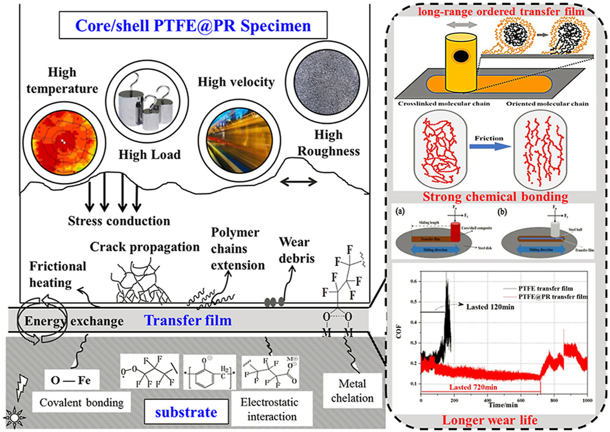 Tribological studies have shown that polytetrafluoroethylene @ phenolic resin core/shell (PTFE@PR) composite maintained excellent tribological properties under harsh working conditions (120 degrees C, 0.1 m/s, 100 N, friction pair with roughness of 2.528 mu m), suggesting the core/shell composite would be a candidate lubricating material with multi-environmental adaptability. The friction-induced transfer film with long-range ordered crystal structure and fiber-like morphology was observed by scanning electron microscope, while the strong chemical bonding between the PTFE-PR transfer film and friction pair was confirmed by X-ray photoelectron spectroscopy. The crystallinity of the long-range ordered transfer film and wear debris under the shear force is higher than that of the original specimens by attenuated total reflection Fourier transform infrared spectroscopy. Besides, the wear life of the PTFE@PR transfer film was six times higher than that of PTFE, reflecting its long durability.