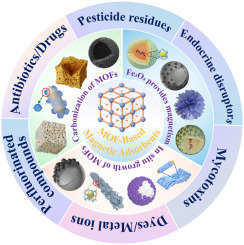 Magnetic solid-phase extraction (MSPE) technology is widely applied for the pre-concentration of trace contaminants in complex environmental and food matrices due to its simplicity, eco-friendliness, high efficiency, ease of operation, and convenient adsorbent recovery. As the core component of this technique, developing highperformance magnetic adsorbents with outstanding adsorption capacity and excellent magnetic response remains a key research focus. In recent years, a series of MOF-based magnetic adsorbents (MMOFs) have been developed based on the superior physicochemical properties of metal-organic frameworks (MOFs) for adsorbing and extracting emerging pollutants in the environment and food. This review systematically summarizes the preparation methods of MMOFs and their applications in extracting pollutants from complex matrices, while outlining future development directions. It aims to provide a theoretical foundation and reference for designing novel MMOFs and confirms the significant potential of MOFs in sample pretreatment applications through comprehensive analysis.