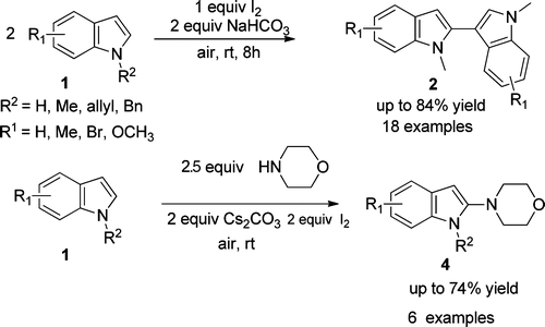 Synthesis of 2,30-biindolyl7a-d and 4-(1H-indol-2-yl)morpholine scaffolds,7e which are useful structural units that are frequently found in pharmaceuticals and functional materials, look quite attractive. Both chemical and enzymatic synthetic methods have been reported for the construction of biindolyls. However, most of the procedures require expensive metal catalysts and high loading of metal oxidants and more attention has been paid to the direct C-C bond formation of indoles. Moreover, examples of the direct functionalization of indoles with selective C-N bond formation are rarely reported. Therefore, a new and effective practical reaction system, involving mild, environmently benign, atom economic, and metal-free conditions, for the regioselective construction of C-C and C-N bonds of N-protected indole derivatives is still of high demand in modern organic synthesis.